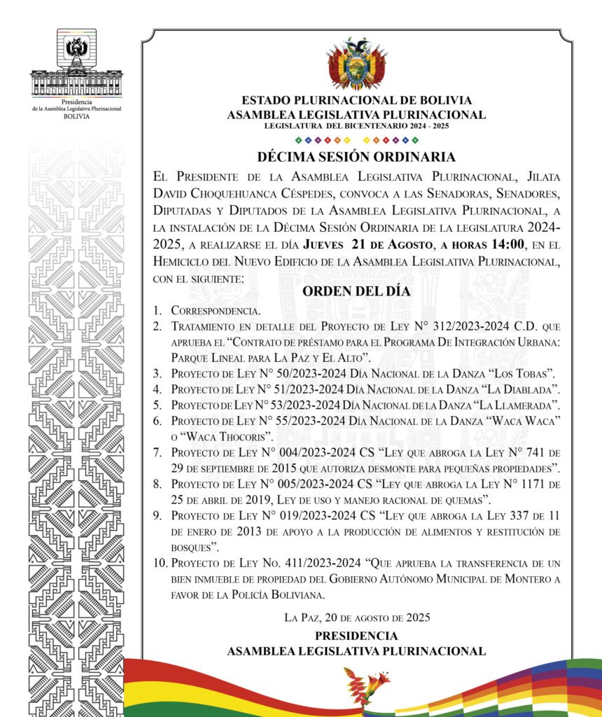 “El presidente de la Asamblea Legislativa Plurinacional David Choquehuanca, convoca a las Senadoras, Senadores, Diputadas y Diputados, de la Asamblea Legislativa a la Decima Sesión Ordinaria de la legislatura 2024-2025”, señala la convocatoria.