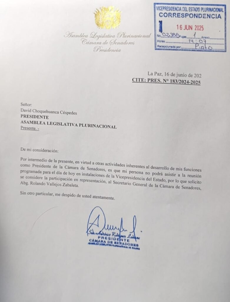 Sin embargo a este encuentro no asistió el presidente del Senado, Andrónico Rodríguez, quien argumentó que sus tareas de presidente de esa instancia legislativa le impiden asistir a este nuevo encuentro. Andrónico Rodríguez es también candidato de la Alianza Popular para las elecciones de agosto.