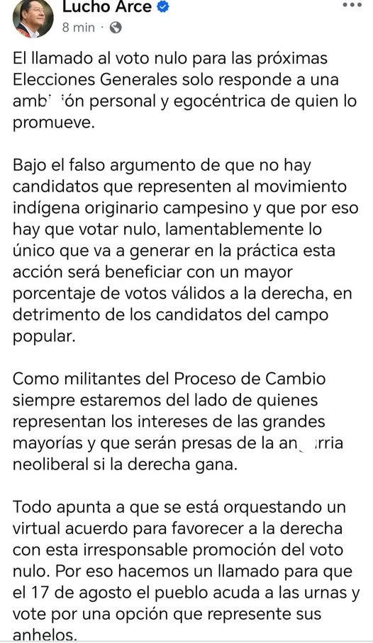 “El llamado al voto nulo para las próximas Elecciones Generales solo responde a una ambición personal y egocéntrica de quien lo promueve. Bajo el falso argumento de que no hay candidatos que representen al movimiento indígena originario campesino y que por eso hay que votar nulo, lamentablemente lo único que va a generar en la práctica esta acción será beneficiar con un mayor porcentaje de votos válidos a la derecha, en detrimento de los candidatos del campo popular”, escribió en sus redes sociales.