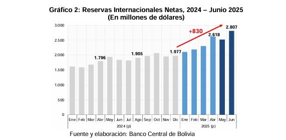 - Crecimiento sostenido de las Reservas Internacionales Netas (RIN): Al cierre del primer semestre de 2025, las RIN llegaron a $us2.807 millones, lo que representa un incremento del 42% respecto del cierre de diciembre de 2024 ($us1.977 millones). Este desempeño permite superar los umbrales de referencia determinados por organismos internacionales al cubrir más de tres meses de importaciones de bienes y servicios, y más de una vez el servicio de la deuda externa de corto plazo.