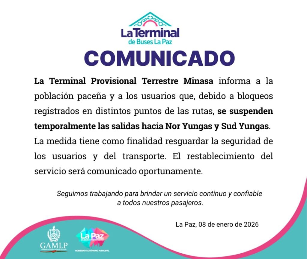 Mediante un comunicado, la Alcaldía de La Paz informó que quedan suspendidos, de manera temporal, los viajes hacia Nor Yungas y Sud Yungas debido a los cortes de vía, con el objetivo de precautelar la seguridad de los pasajeros y del transporte. La entidad señaló que la reanudación del servicio será anunciada oportunamente.
