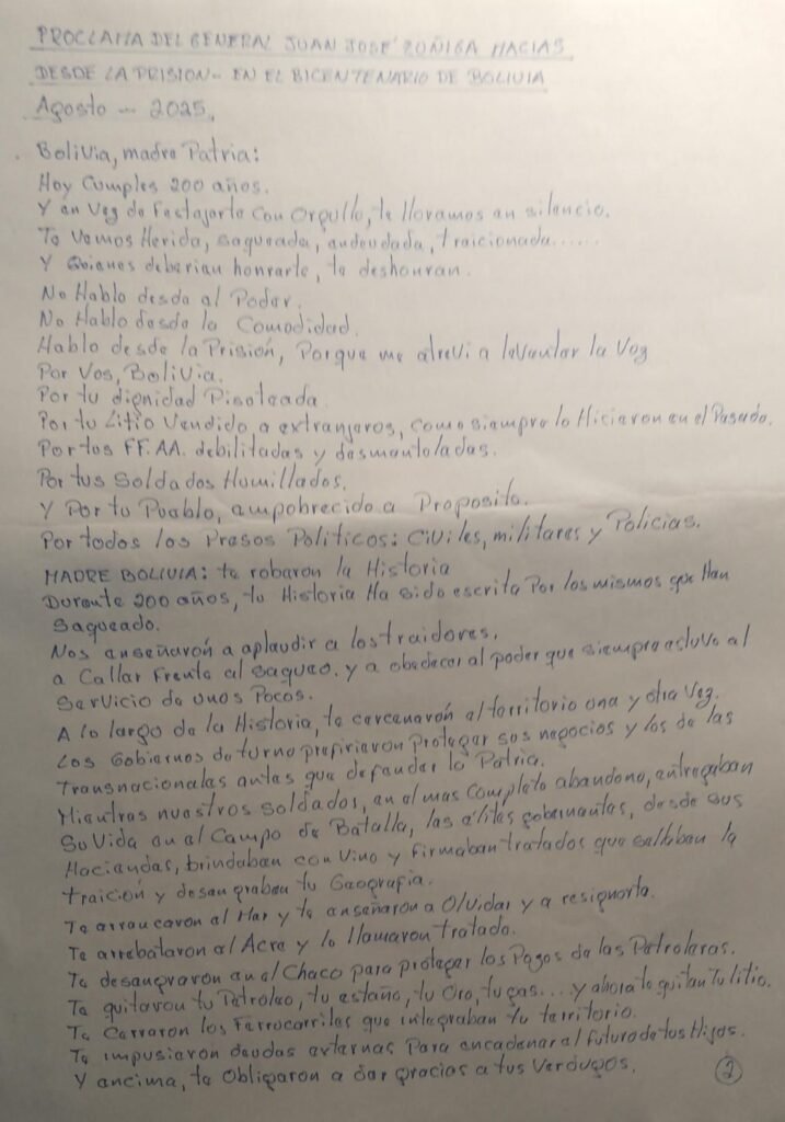 Éxito Noticias, 4 de agosto 2025.- Desde su celda, el general Juan José Zúñiga Macías lanzó una dura proclama en el marco del Bicentenario de Bolivia. Denunció el saqueo histórico del país por sus propios gobernantes, el empobrecimiento deliberado del pueblo y la traición de las élites políticas y económicas.