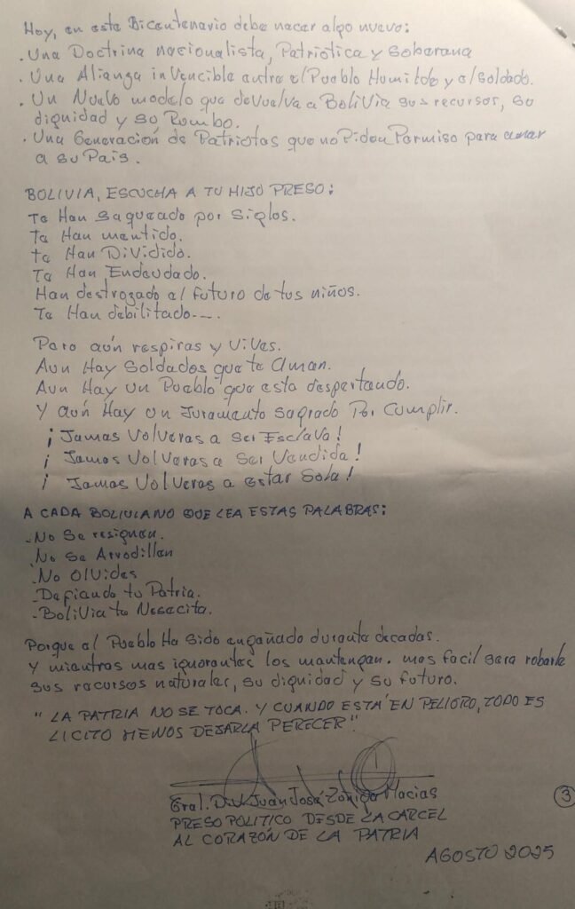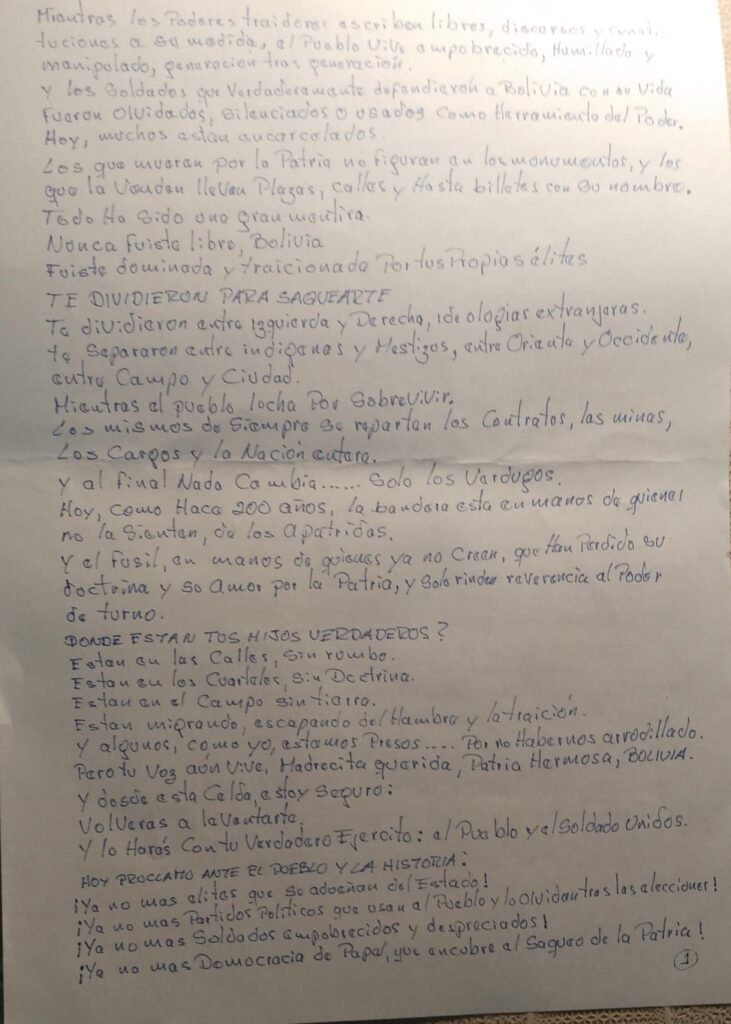 “A cada boliviano que lea estas palabras: No te resignes. No te arrodilles. No olvides. Defiende a tu patria. Bolivia te necesita”, resaltó.