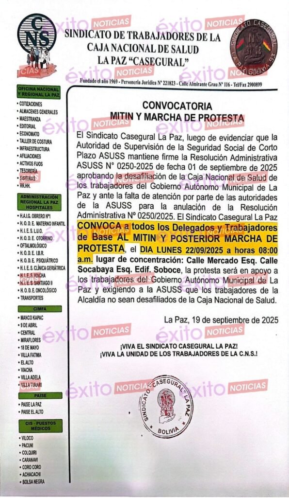 “El Sindicato Casegural La Paz Convoca a todos los delegados y trabajadores de base al mitin de protesta y posterior marcha e l lunes 22/9/2025 a horas 08:00 am, lugar de concentración Calle Mercado esquina Socabaya, edificio ExSoboce, la protesta será en apoyo a los trabajadores del Gobierno Autónomo Municipal de La Paz, exigiendo que la ASUSS no desafilie a estos trabajadores de la Caja Nacional de Salud”, detalla el comunicado.