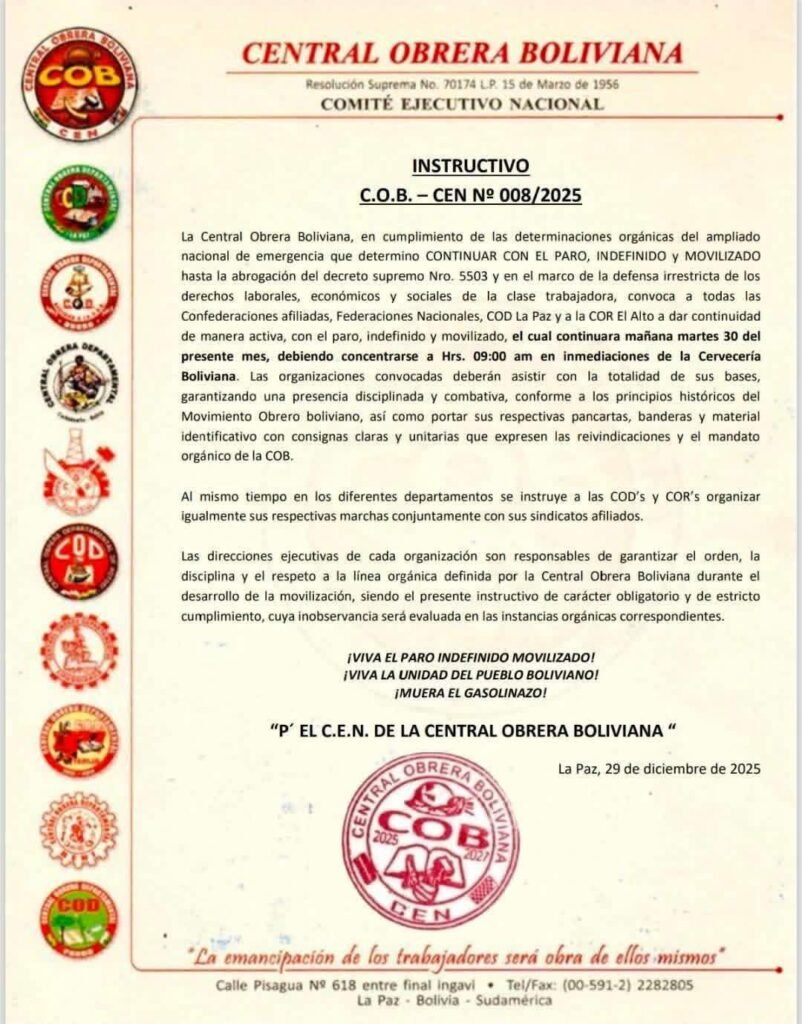 Éxito Noticias, 29 de diciembre 2025.- La Central Obrera Boliviana (COB) emitió un instructivo en el que confirma la continuidad del paro indefinido y movilizado, en cumplimiento de las determinaciones del ampliado nacional de emergencia. La medida busca la abrogación del Decreto Supremo 5503, considerado por la dirigencia como lesivo para los derechos laborales, económicos y sociales de la clase trabajadora.