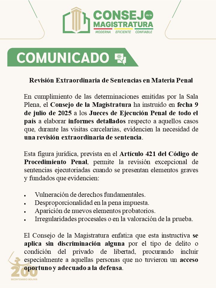 Éxito Noticias, 25 de agosto 2025.- El Consejo de la Magistratura dispuso la revisión extraordinaria de sentencias ejecutoriadas en materia penal, una medida que busca atender posibles vulneraciones a derechos fundamentales y garantizar el acceso a la justicia de las personas privadas de libertad.