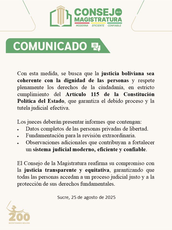 “Con esta instructiva se busca que la justicia boliviana sea coherente con la dignidad de las personas y respete plenamente los derechos de la ciudadanía”, señala el comunicado oficial, citando además el Artículo 115 de la Constitución Política del Estado, que garantiza el debido proceso y la tutela judicial efectiva.