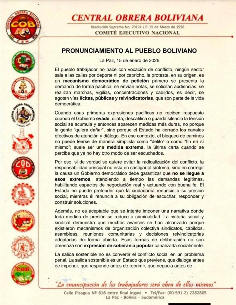 Éxito Noticias, 15 de enero 2026.- La Central Obrera Boliviana (COB) lanzó un pronunciamiento en el que cuestiona la intención de criminalizar las protestas sociales y advirtió que esa estrategia no traerá paz al país. La organización sindical recalcó que las movilizaciones son un mecanismo democrático de petición y que surgen únicamente después de agotar instancias pacíficas como solicitudes de audiencia, marchas, vigilias y cabildos.