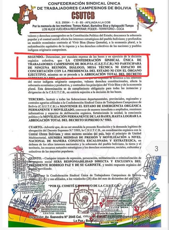 “Determinar por mandato de las bases y en ejercicio de la decisión orgánica, la Confederación Sindical Única de Trabajadores Campesinos de Bolivia no participará de ninguna reunión, dialogo, mesa técnica, ni espacio de concertación con la presidencia o el estado mientras no se proceda a la abrogación total del DS 5503”, detalla el documento.