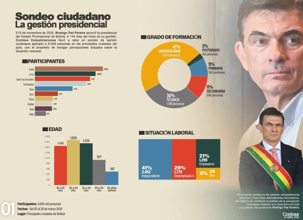 Éxito Noticias, 5 de abril 2026.- Un sondeo ciudadano realizado por la empresa Coolosa muestra que la gestión del presidente Rodrigo Paz enfrenta un fuerte rechazo a poco más de cuatro meses de iniciado su mandato. La encuesta, aplicada en las principales ciudades del país, refleja un clima de descontento generalizado y baja confianza hacia el Gobierno.