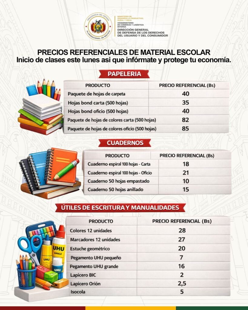 A través de sus redes sociales, la institución publicó una lista de precios referenciales de los principales útiles escolares, destinada a que los compradores puedan identificar cobros excesivos y tomar decisiones informadas.