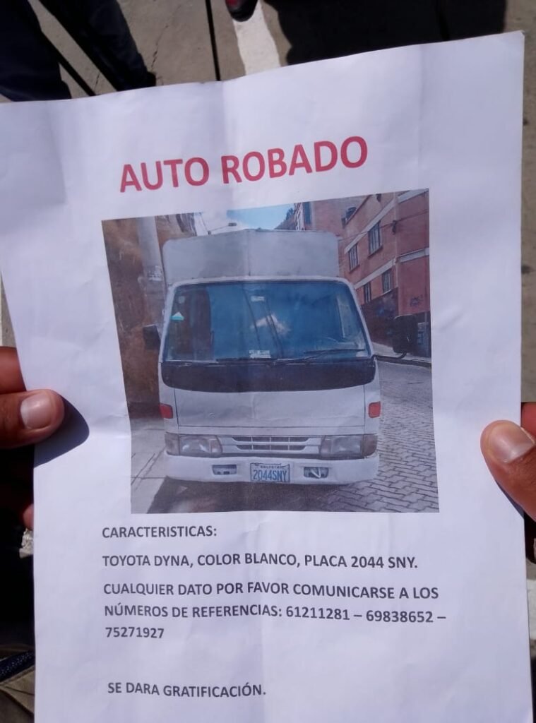 Éxito Noticias, 25 de octubre 2025.– Un joven repartidor fue víctima de un violento robo en la avenida Periférica de la ciudad de La Paz, donde dos sujetos le sustrajeron su furgoneta mediante engaños y lo arrastraron varios metros al intentar evitar el robo. El vehículo, un Toyota tipo furgón color blanco, era su única herramienta de trabajo para la distribución de pollo.
