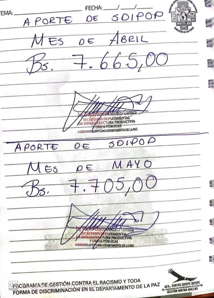 “Tenemos información que estos aportes también se han realizado en otras dependencias de la Gobernación de La Paz, hay aportes por 7.575, lo hace el señor Huacner que es el secretario de Infraestructura del departamento de La Paz, aporte de abril y mayo del mismo señor, vamos a convocar a este señor para que nos diga a quien dio este dinero, esto asusta porque así se maneja el departamento La Paz”, declaro el asambleísta Alanoca.