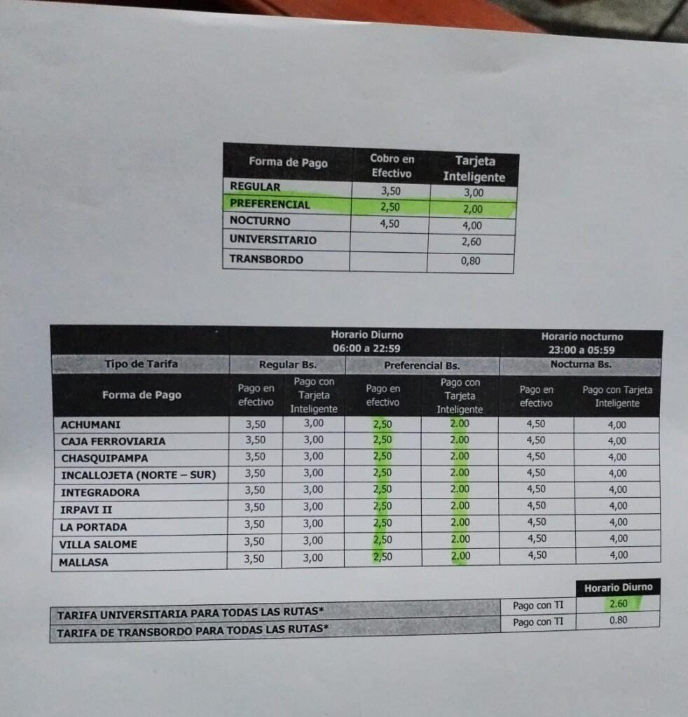 «La tarifa preferencial es de 2,50 en efectivo y 2 bolivianos con la Tarjeta Inteligente», destacó Millares, a tiempo de señalar que el costo para los universitarios será una «tarifa plana de 2,60 bolivianos y el uso de transbordo es de 0,80 centavos».