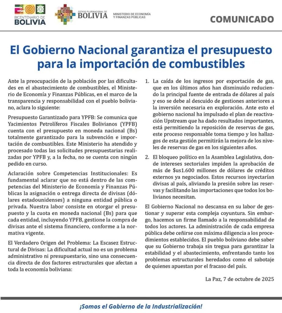 Éxito Noticias, 8 de octubre 2025.- El Ministerio de Economía y Finanzas Públicas aclaró que Yacimientos Petrolíferos Fiscales Bolivianos (YPFB) dispone del presupuesto necesario en bolivianos para la importación de combustibles, pero subrayó que la gestión de divisas es responsabilidad directa de la estatal petrolera ante el sistema financiero.