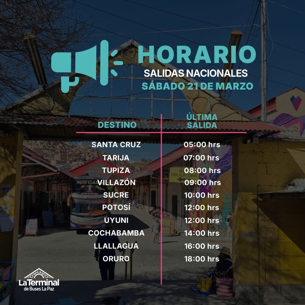 De acuerdo con la administración, las salidas se realizarán de manera escalonada desde las 05:00, con distintos horarios según el destino. Entre los primeros viajes programados están los que parten hacia Santa Cruz (05:00), Tarija (07:00) y Tupiza (08:00), mientras que otros destinos como Villazón, Sucre y Potosí tendrán salidas durante la mañana y el mediodía. El último servicio nacional está previsto hacia Oruro a las 18:00.