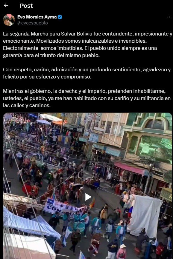 “La segunda marcha para Salvar Bolivia fue contundente, impresionante y emociónate, movilizados somos inalcanzables e invencibles. Electoralmente somos imbatibles, el pueblo unido siempre es una garantía para el triunfo del mismo pueblo”, señala el mensaje.