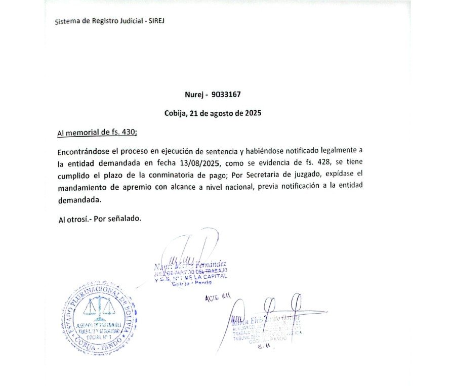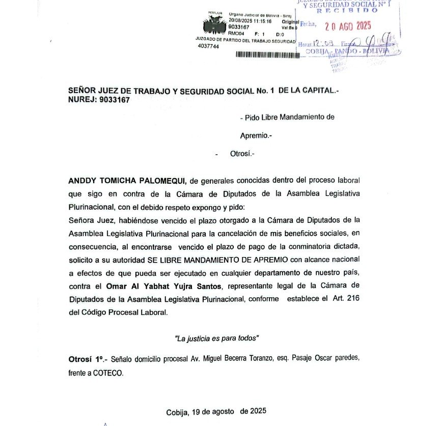 “Señora Juez habiéndose vencido el plazo otorgado a la Cámara de Diputados para la cancelación de mis beneficios sociales, en consecuencia, al encontrarse vencido el plazo de pago de la conminatoria dictada, solicito a su autoridad de ‘se libre mandamiento de apremio’ con alcance nacional contra el representante legal de la Cámara de Diputados, Omar Al Yabhat Yujra Santos, conforme estable el articulo 216 del Codigo Procesal Laboral”, detalla.