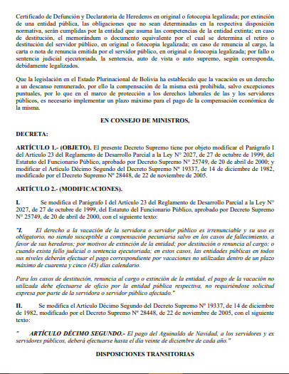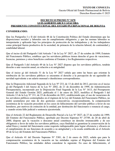 La disposición fue firmada por el presidente Luis Arce Catacora y el gabinete de ministros para garantizar el cumplimiento de los derechos laborales y reforzar el carácter irrenunciable y obligatorio del descanso anual de las y los servidores públicos, conforme al Estatuto del Funcionario Público (Ley Nº 2027).