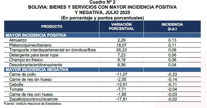 Los productos con mayor incidencia positiva fueron: almuerzo, plátano/guineo/banano,