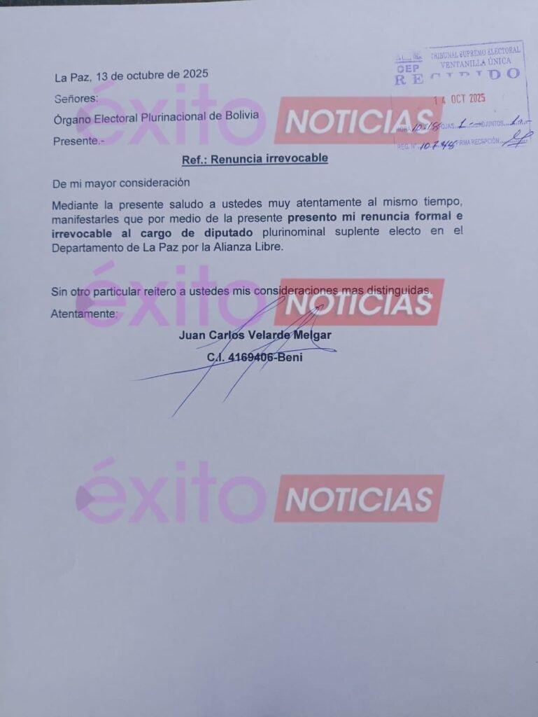 Éxito Noticias, 14 de octubre 2025.- Tras las declaraciones realizadas por el diputado plurinominal por la Alianza Libre, Juan Carlos Velarde, sobre insultos hacia las personas que mascan coca, el mismo formalizo su renuncia ante el Tribunal Supremo Electoral (TSE).