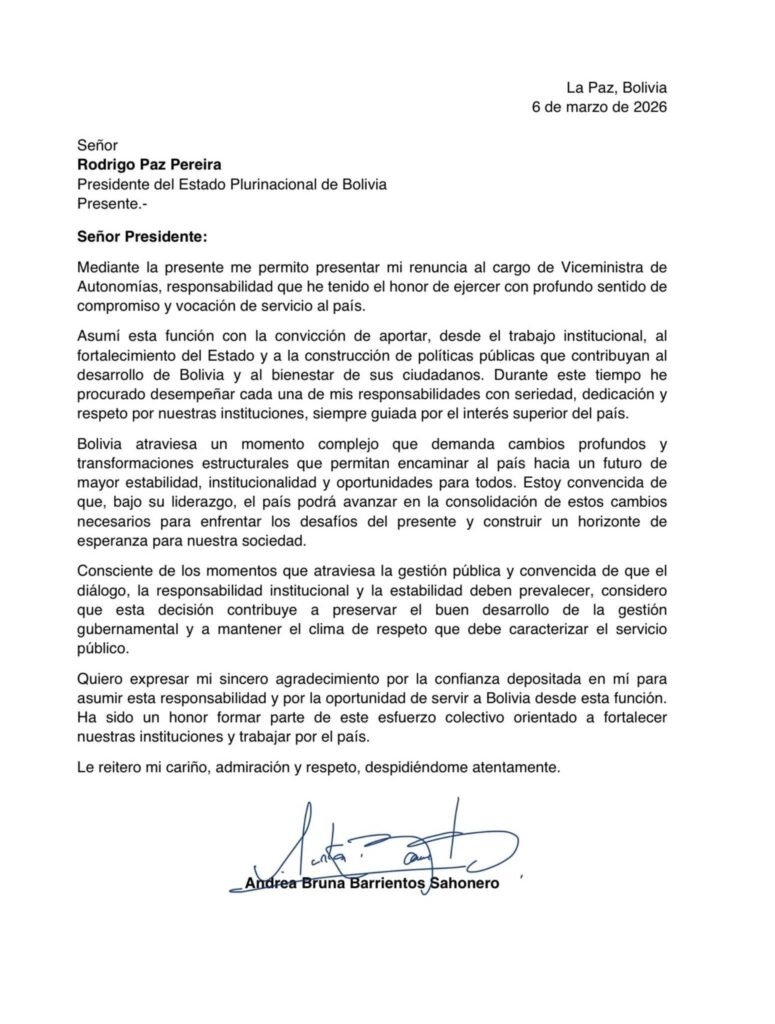 Éxito Noticias, 6 de marzo 2026.– La viceministra de Autonomías, Andrea Barrientos, presentó este viernes por la noche su renuncia al cargo mediante una carta dirigida al presidente de Bolivia, Rodrigo Paz. La autoridad explicó que su decisión responde a una etapa cumplida en su vida pública, destacando que ejerció la función con compromiso y vocación de servicio.