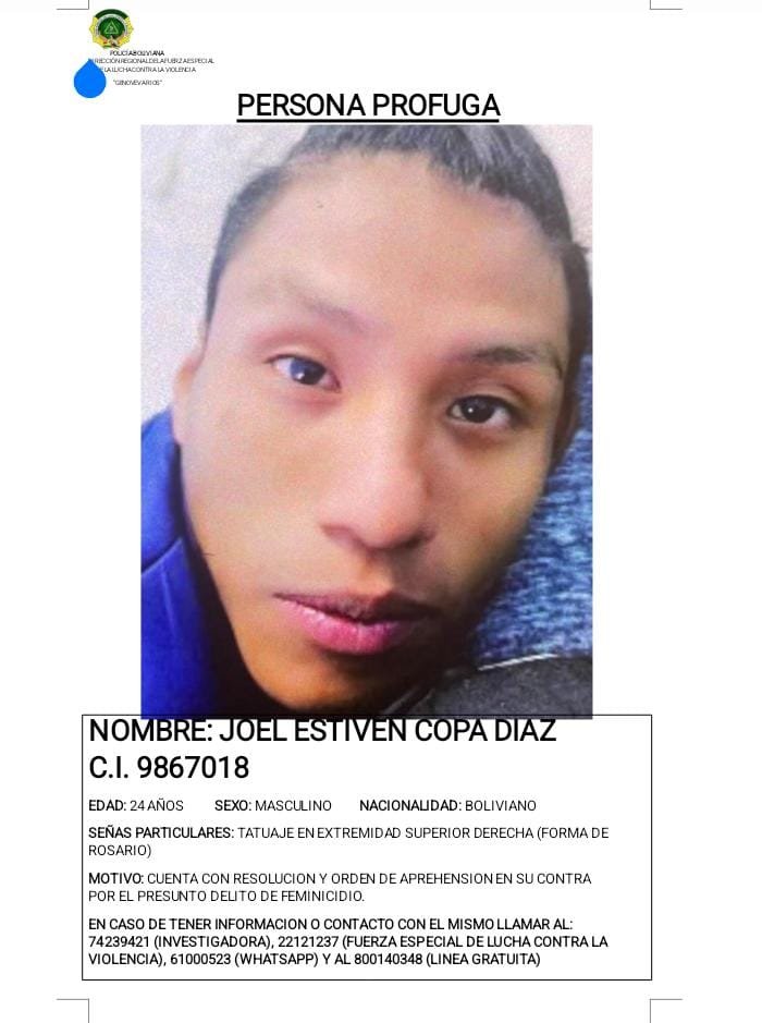 La Fuerza Especial de Lucha Contra la Violencia (FELCV) elaboró un afiche con la imagen del presunto autor, el cual fue difundido a nivel departamental, nacional y provincial. El objetivo es que cualquier persona que tenga información sobre su paradero pueda comunicarlo de manera inmediata a las autoridades.