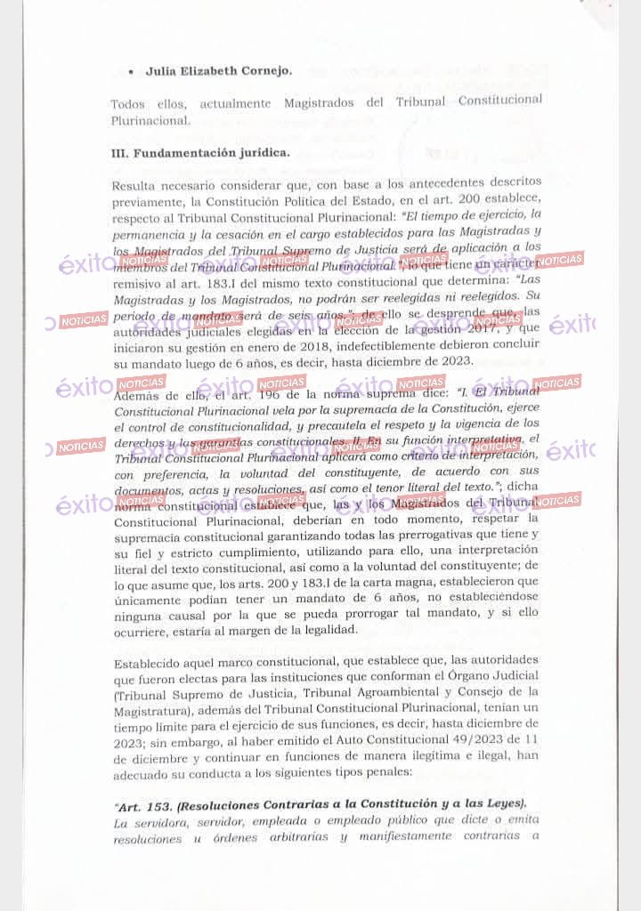 “Las personas denunciadas son Gonzalo Miguel Hurtado, Rene Yvan Espada, Karem Lorena Gallardo, Isidora Jiménez Castro, Julia Elizabeth Cornejo, que actualmente son Magistrados del Tribunal Constitucional Plurinacional (TCP)”, detalla la denuncia.