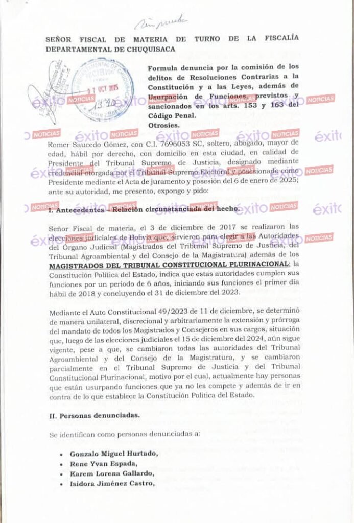 Éxito Noticias, 7 de octubre 2025.- El presidente del Tribunal Supremo de Justicia (TSJ), Romer Saucedo, en el departamento de Chuquisaca presento ante la Fiscalía General del Estado una denuncia por los delitos de resoluciones contrarias a la constitución y las leyes, usurpación de funciones, contra Magistrado auto prorrogados.