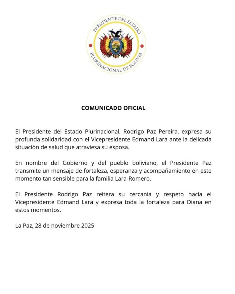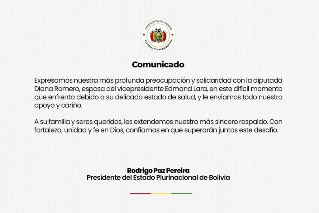 “A nombre del Gobierno y del pueblo boliviano, el presidente Paz, transmite un mensaje de fortaleza, esperanza, acompañamiento en este momento tan sensible para la familia Lara-Romero. El presidente Paz reitera su cercanía y respeto hacia el vicepresidente, Edmand Lara y expresa toda la fortaleza para Diana en estos momentos.