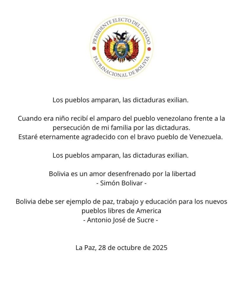 Éxito Noticias, 28 de octubre 2025.- Desde la oficina del presidente electo de Bolivia, Rodrigo Paz, resaltó que esta agradecido con el país vecino de Venezuela porque lo acogió cuando su familia era perseguida políticamente.