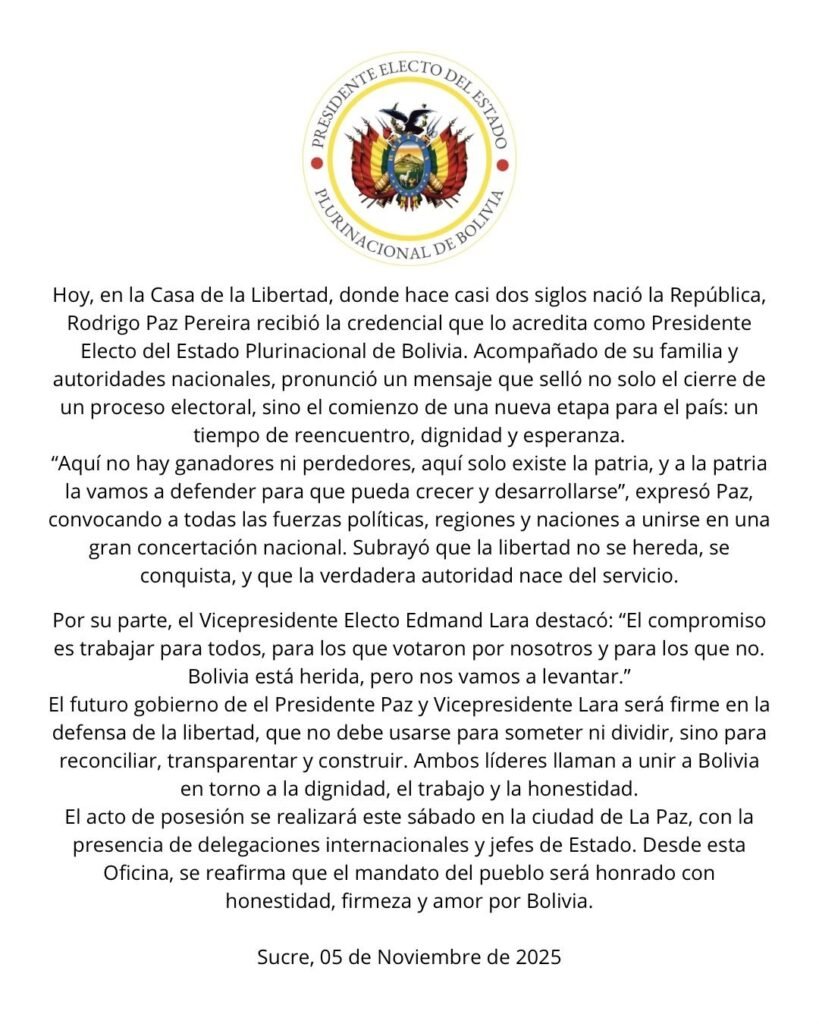 Éxito Noticias, 5 de noviembre 2025.- En la Casa de la Libertad donde hace casi dos siglos nació la Republica de Bolivia, Rodrigo Paz Pereira, recibió la credencial que lo acredita como presidente electo del Estado Plurinacional de Bolivia, acompañado por su familia y autoridades nacionales, marco el inicio de una nueva etapa para el país.