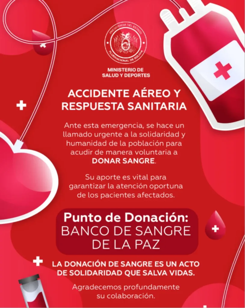 Éxito Noticias, 28 de febrero 2026.- Ante la emergencia provocada por el accidente aéreo en El Alto, el Ministerio de Salud y Deportes declaró Estado de Contingencia y pidió a la población acudir de forma voluntaria a donar sangre.