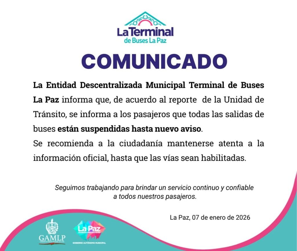 Éxito Noticias, 7 de enero 2026.- La Terminal de Buses de La Paz confirmó este miércoles la suspensión total de las salidas de buses interdepartamentales hasta nuevo aviso, debido a la situación de bloqueos de carreteras a nivel nacional.
