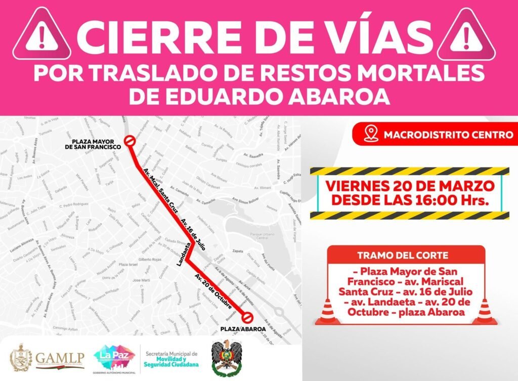El desplazamiento atravesará varias vías principales, entre ellas la avenida Mariscal Santa Cruz, El Prado y la avenida 20 de Octubre, por lo que se dispuso el cierre de calles en el macrodistrito Centro desde las 15:00.