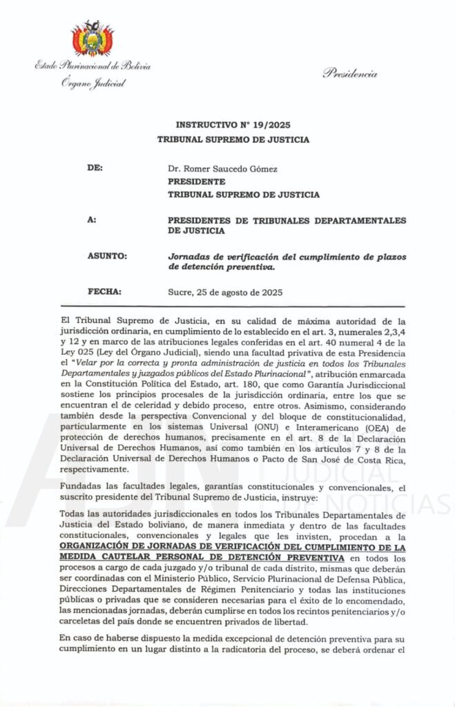 Éxito Noticias, 25 de agosto 2025.- El presidente del Tribunal Supremo de Justicia (TSJ), Romer Saucedo Gómez, emitió el Instructivo N°19/2025, para la organización de jornadas de verificación de plazos de la medida cautelar de detenciones preventivas.