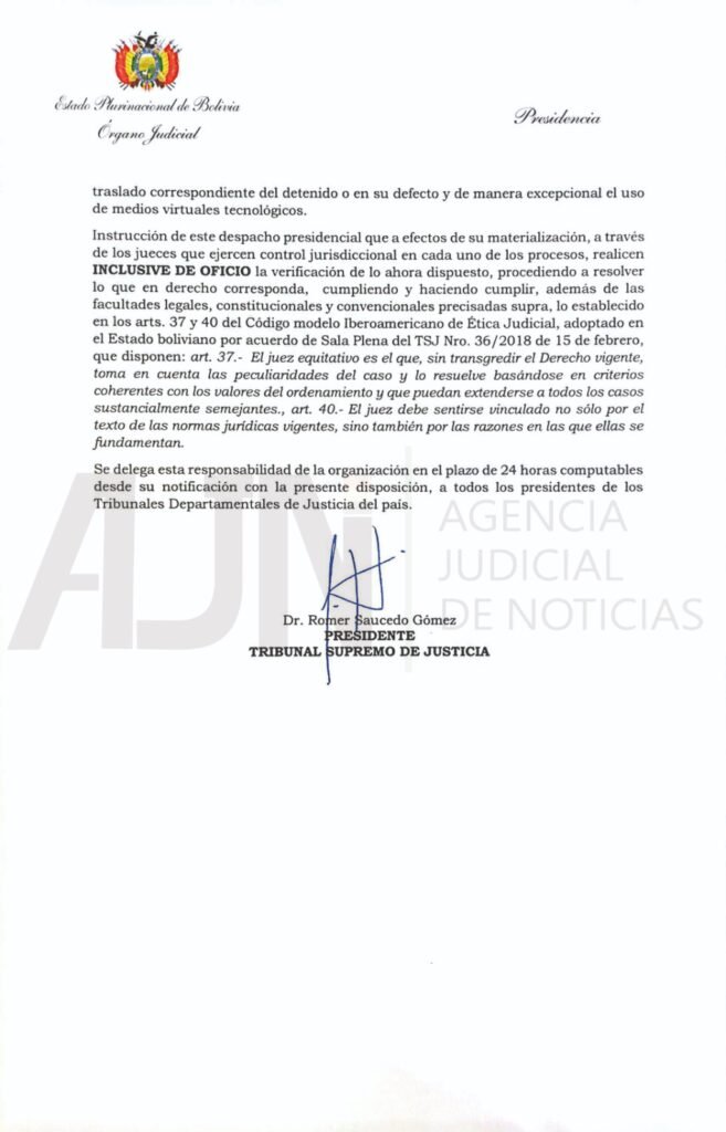 “Todas las autoridades jurisdiccionales en todos los Tribunales Departamentales de Justicia del Estado boliviano, de manera inmediata y dentro de sus facultades constitucionales, convencionales y legales que les invisten procedan a la Organización de Jornadas de Verificación de cumplimiento de la medida cautelar personal de detención preventiva en todos los procesos a cargo de cada juzgado o tribunal de cada distrito, mismas que deberán de coordinarse con Régimen Penitenciario, Ministerio Publico, Servicio Plurinacional de Defensa Publica, y otras instituciones, estas jornadas deberán cumplirse en todos los recintos penitenciarios”, detalla el instructivo.