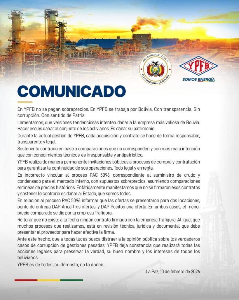 En un comunicado oficial, YPFB sostuvo que en la empresa “no se pagan sobreprecios” y que las versiones difundidas tienen como objetivo desviar la atención de casos de corrupción de gestiones anteriores. Por ello, la petrolera anunció que activará acciones legales para proteger su reputación, la veracidad de la información y los intereses del Estado.